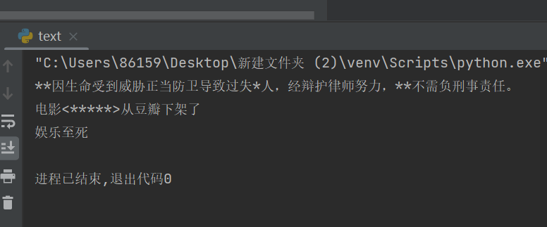 1 words_sensitive_list = ['张三', 'V字仇杀队', '杀'] 2 comments_list = ['张三因生命受到威胁正当防卫导致过失杀人,经辩护律师努力,张三不需负刑事责任。','电影<V字仇杀队>从豆瓣下架了','娱乐至死'] 3 comments_list='\n'.join(comments_list) 4 for i in words_sensitive_list: 5 if i in comments_list: 6 x=comments_list.index(i) 7 comments_list=comments_list.replace(comments_list[x:x+len(i)],'*'*len(i)) 8 print(comments_list)