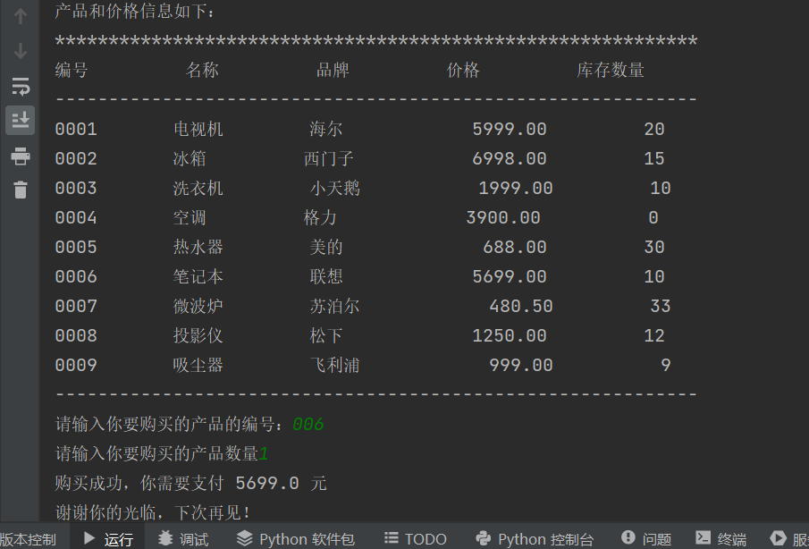 1 """ 2 家用电器销售系统 3 v1.0 4 """ 5 6 #欢迎信息 7 print('欢迎使用家用电器销售网络!') 8 9 #产品信息列表 10 print('产品和价格信息如下:') 11 print('*'*60) 12 print('%-10s'%'编号', '%-10s'%'名称', '%-10s'%'品牌', '%-10s'%'价格', '%-10s'%'库存数量') 13 print('-'*60) 14 print('%-10s'%'0001', '%-10s'%'电视机', '%-10s'%'海尔', '%10.2f'%5999.00, '%10d'%20) 15 print('%-10s'%'0002', '%-10s'%'冰箱', '%-10s'%'西门子', '%10.2f'%6998.00, '%10d'%15) 16 print('%-10s'%'0003', '%-10s'%'洗衣机', '%-10s'%'小天鹅', '%10.2f'%1999.00, '%10d'%10) 17 print('%-10s'%'0004', '%-10s'%'空调', '%-10s'%'格力', '%10.2f'%3900.00, '%10d'%0) 18 print('%-10s'%'0005', '%-10s'%'热水器', '%-10s'%'美的', '%10.2f'%688.00, '%10d'%30) 19 print('%-10s'%'0006', '%-10s'%'笔记本', '%-10s'%'联想', '%10.2f'%5699.00, '%10d'%10) 20 print('%-10s'%'0007', '%-10s'%'微波炉', '%-10s'%'苏泊尔', '%10.2f'%480.50, '%10d'%33) 21 print('%-10s'%'0008', '%-10s'%'投影仪', '%-10s'%'松下', '%10.2f'%1250.00, '%10d'%12) 22 print('%-10s'%'0009', '%-10s'%'吸尘器', '%-10s'%'飞利浦', '%10.2f'%999.00, '%10d'%9) 23 print('-'*60) 24 25 #商品数据 26 products=[ 27 ['0001','电视机', '海尔',5999.00,20], 28 ['0002','冰箱', '西门子',6998.00,15], 29 ['0003','洗衣机', '小天鹅',1999.00,10], 30 ['0004','空调', '格力',3900.00,0], 31 ['0005','热水器', '格力',688.00,30], 32 ['0006','笔记本', '联想',5699.00,10], 33 ['0007','微波炉', '苏泊尔',480.00,33], 34 ['0008','投影仪', '松下',1250.00,12], 35 ['0009','吸尘器', '飞利浦',999.00,9], 36 ] 37 38 #用户输入信息 39 product_id = input('请输入你要购买的产品的编号:') 40 count = int(input('请输入你要购买的产品数量')) 41 42 #获取编号对应商品的信息 43 product_index=int(product_id)-1 44 product=products[product_index] 45 46 #计算金额 47 print('购买成功,你需要支付',product[3]*count,'元') 48 49 #退出系统 50 print('谢谢你的光临,下次再见!')