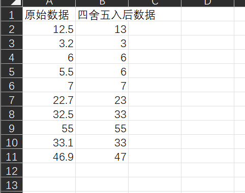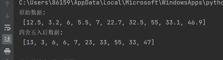 with open ('data6.csv','r',encoding='gbk')as f: o,g=[],[] reader=f.readlines() for i in range(1,len(reader)): x=eval(reader[i].strip('\n')) o.append(x) g.append(int(x+0.5)) reader[i]=[str(x),str(int(x+0.5))] reader[0] = [reader[0].strip('\n'), '四舍五入后数据'] print('原始数据:\n',o) print('四舍五入后数据:\n', g) with open('data6.csv','w',encoding='gbk')as f: for i in range(len(reader)): f.write(','.join(reader[i])+'\n')