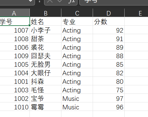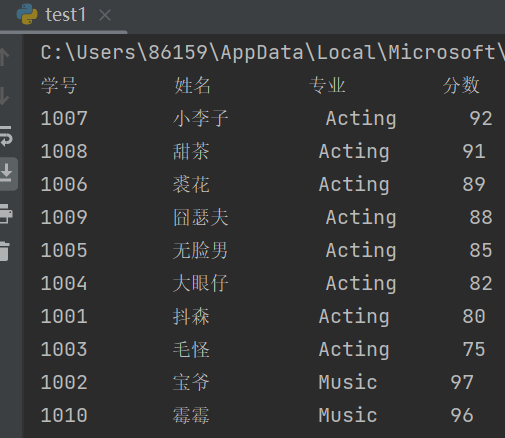 1 with open('data7.csv','r',encoding='gbk')as f: 2 read=f.readlines() 3 data=[read[i].strip('\n').split(',') for i in range(1,len(read))] 4 title=read[0].strip('\n').split(',') 5 s=sorted(data,key=lambda x:x[3],reverse=True) 6 e=sorted(s,key=lambda x:x[2]) 7 for i in title: 8 print(i,end=' ') 9 for i in e: 10 print() 11 for x in i: 12 print(f'{x:<5}',end=' ') 13 with open('data7.csv','w',encoding='gbk')as f: 14 f.write(','.join(title) + '\n') 15 for item in e: 16 f.write(','.join(item) + '\n')