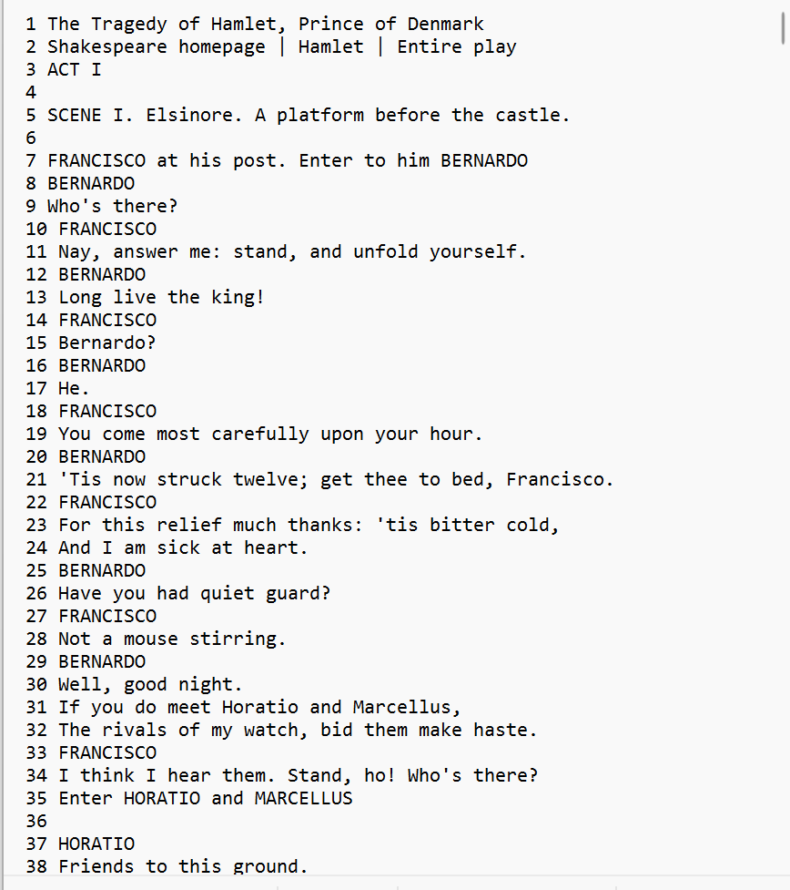 1 with open('hamlet.txt','r',encoding='utf-8')as f: 2 l=f.read() 3 n=l.split() 4 x=l.split('\n') 5 print('行数:',len(x)) 6 print('单词数:',len(n)) 7 print('字符数:',len(l)) 8 print('空格数:',l.count(' ')) 9 with open('hamlet_with_line_number.txt','w',encoding='utf-8')as f: 10 for i in range(len(x)): 11 f.write(f'{i+1} '+x[i]+'\n')