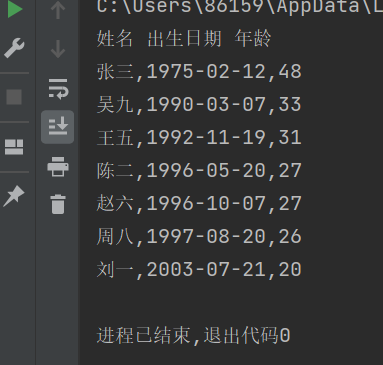 1 def is_valid(x): 2 if len(x)!=18: 3 return False 4 for i in range(len(x)-1): 5 if x[i] not in '1234567890': 6 return False 7 if x[17] not in '1234567890X': 8 return False 9 else: 10 return True 11 with open('data9_id.txt','r',encoding='utf-8')as f: 12 data=f.readlines() 13 l=[line.strip('\n').split(',') for line in data] 14 x=[i for i in l if is_valid(i[1])] 15 for i in x: 16 i.append(2023 - eval(i[1][6:10])) 17 i[1]=i[1][6:10]+'-'+i[1][10:12]+'-'+i[1][12:14] 18 x=sorted(x,key=lambda i:i[2],reverse=True) 19 print('姓名','出生日期','年龄') 20 for i in x: 21 print(','.join(str(a) for a in i))