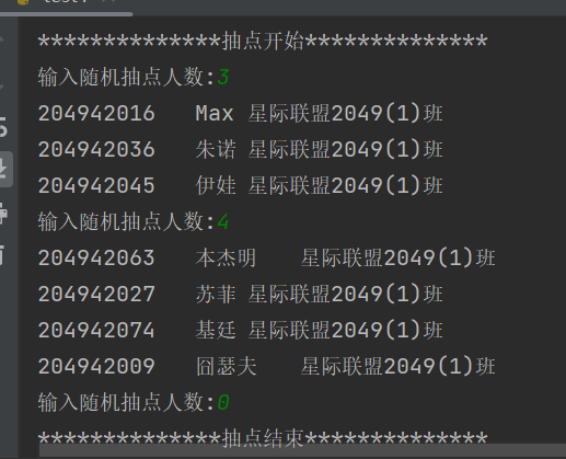 1 import datetime 2 import random 3 with open('data10_stu.txt','r',encoding='utf-8')as f: 4 data=f.readlines() 5 m=datetime.date.today() 6 print('*'*14+'抽点开始'+'*'*14) 7 y,x=set(),0 8 while True: 9 c,n=set(),eval(input('输入随机抽点人数:')) 10 x+=n 11 if n==0: 12 print('*'*14+'抽点结束'+'*'*14) 13 break 14 while len(y)<x: 15 a=random.randint(0,79) 16 if data[a] not in y: 17 c.add(data[a]) 18 y.add(data[a]) 19 for i in list(c): 20 print(i.strip('\n')) 21 with open(f'{m}.txt','w',encoding='utf-8')as f: 22 for i in list(y): 23 f.write(i)