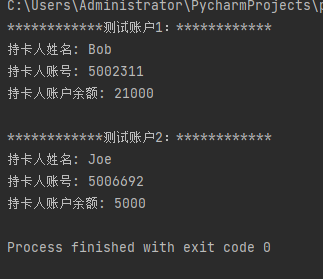 1 class Account: 2 '''一个模拟银行账户的简单类''' 3 def __init__(self, name, account_number, initial_amount = 10): 4 '''构造新账户''' 5 self._name = name 6 self._card_no = account_number 7 self._balance = initial_amount 8 def deposit(self, amount): 9 '''存款''' 10 self._balance += amount 11 def withdraw(self, amount): 12 '''取款''' 13 if self._balance < amount: 14 print('余额不足') 15 return 16 self._balance -= amount 17 18 def info(self): 19 '''打印账户信息''' 20 print('持卡人姓名:', self._name) 21 print('持卡人账号:', self._card_no) 22 print('持卡人账户余额:', self._balance) 23 24 def get_balance(self): 25 '''返回账户余额''' 26 return self._balance 27 def main(): 28 '''创建Account类对象,测试类''' 29 30 print('测试账户1:'.center(30, '*')) 31 a1 = Account('Bob', '5002311', 20000) 32 a1.deposit(5000) 33 a1.withdraw(4000) 34 a1.info() 35 print() 36 print('测试账户2:'.center(30, '*')) 37 a2 = Account('Joe', '5006692', 20000) 38 a2.withdraw(10000) 39 a2.withdraw(5000) 40 a2.info() 41 if __name__ == '__main__': 42 main()