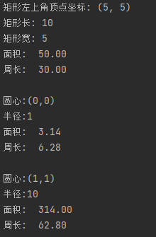 1 from main import Rect,Circle 2 shape_lst = [Rect(5, 5, 10, 5), Circle(), Circle(1, 1, 10)] 3 for i in shape_lst: 4 i.info() 5 print(f'面积: {i.area(): .2f}') 6 print(f'周长: {i.perimeter(): .2f}') 7 print()