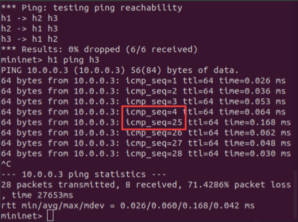问题1:h1 ping h3时,显示Destination Host Unreachable。