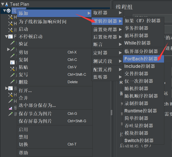 1、在“线程组”添加“逻辑控制器”-->“ForEach控制器”