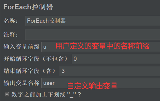 ForEach Controller 即循环控制器,顾名思义是定义一个循环规则。它可以在“用户定义的变量”中定义一组变量,循环控制器可以从中获取到变量对应的值,然后作为循环控制器的循环条件,还可以输出变量作为取样器的参数。
