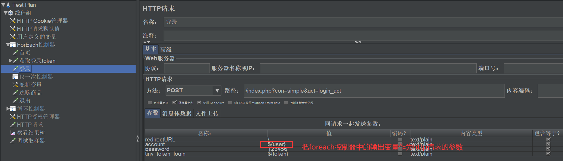 在"ForEach控制器"中添加“http请求”,设置参数化关联