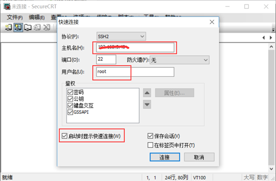 输入要远程的设备的IP地址及用户名,协议和端口默认,勾上“启动时显示快速连接”,点击连接