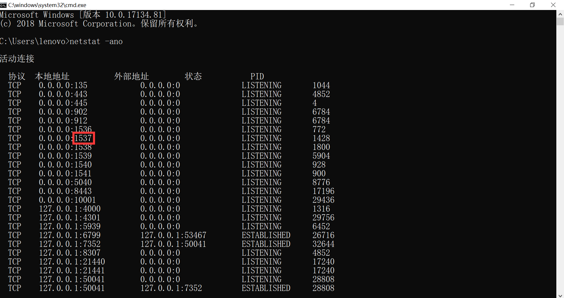 2、输入命令:netstat -ano,列出所有端口的情况。在列表中我们观察被占用的端口,比如是1537,首先找到它。