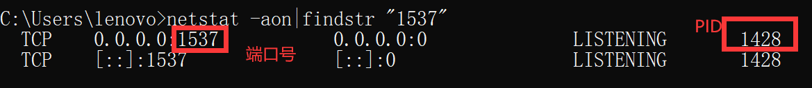 3、查看被占用端口对应的PID,输入命令:netstat -aon|findstr "1537",回车,记下最后一位数字,即PID,这里是1428