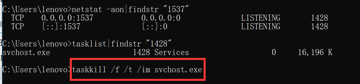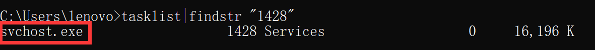 4、继续输入tasklist|findstr "1428",回车,查看是哪个进程或者程序占用了1537端口,结果是:svchost.exe