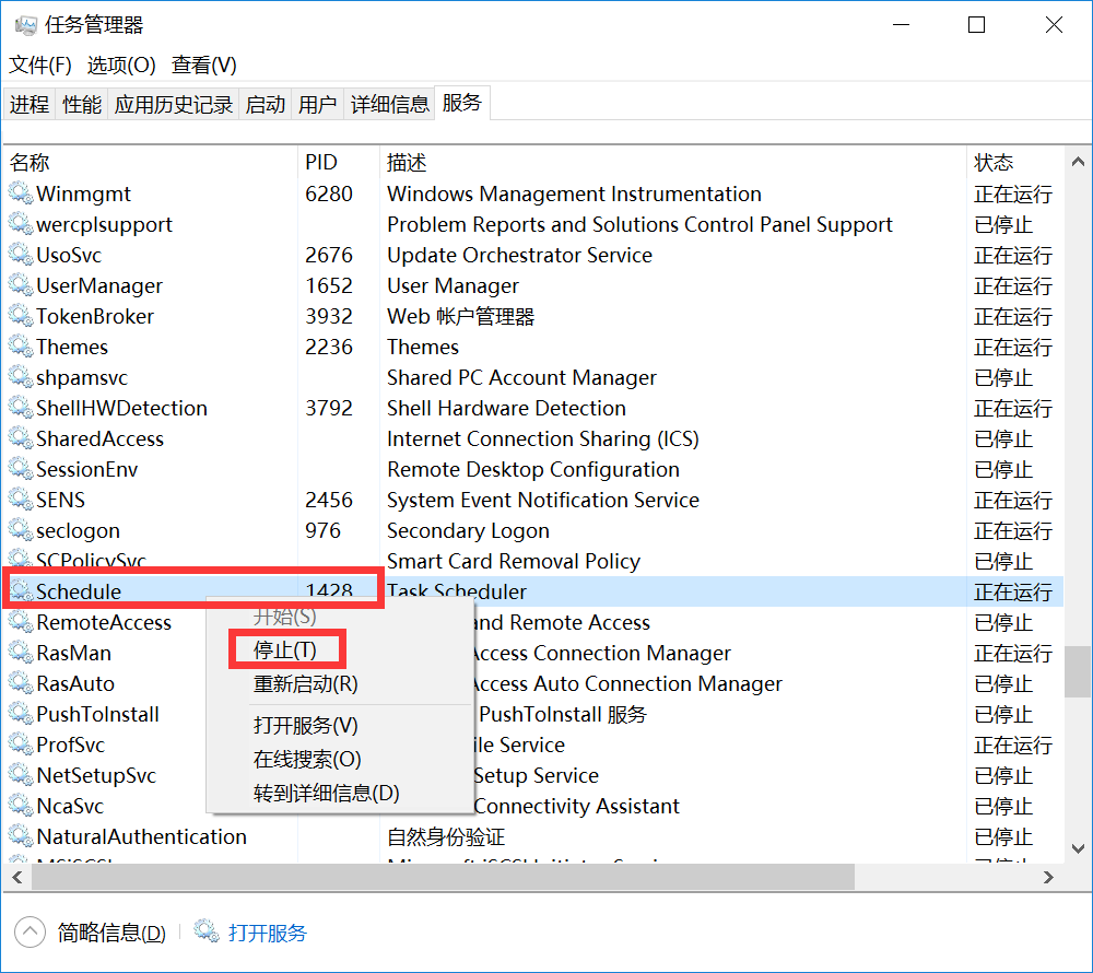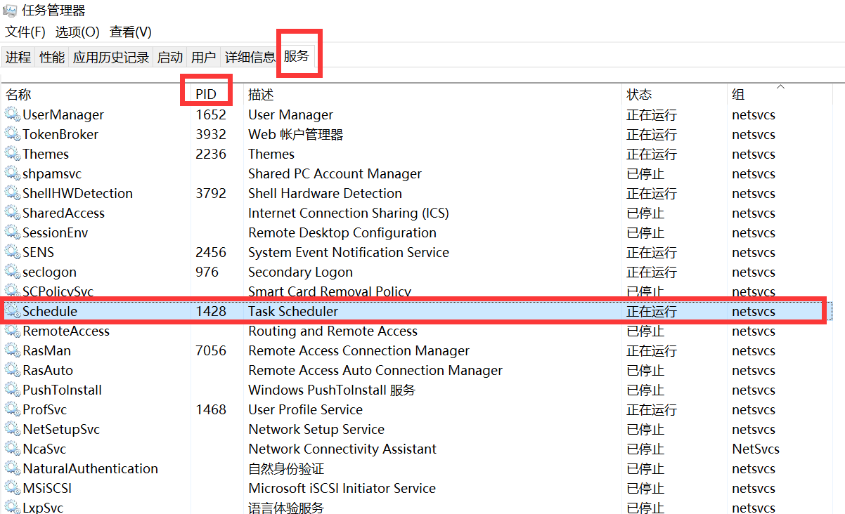 5、或者是我们打开任务管理器,切换到服务选项卡,在PID一列查看1428对应的服务是谁,如下图: