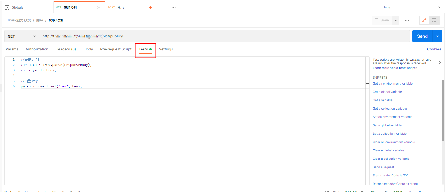 步骤1:接口请求获取公钥,在Tests中将公钥设置为环境变量