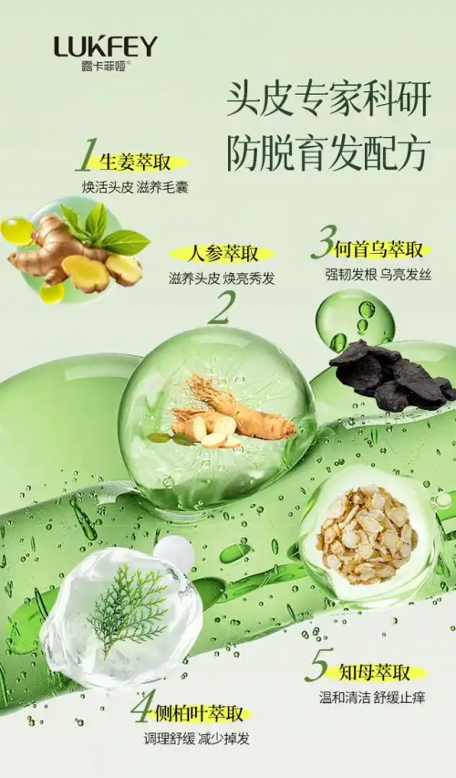 尤为值得一提的是,露卡菲娅防脱洗发水的防脱效果得益于其核心防脱成分的协同作用。其中包括生姜、当归、知母、人参根,何首乌和侧柏叶等多种植物精华成分和独家研发的防脱发因子。这些成分联合作用,能够有效地促进头皮血液循环,增强毛囊的营养供应,从而稳固发根,减少头发的脱落。从发根的滋养到强韧,露卡菲娅防脱洗发水都全方位参与,有效地实现防脱固发的效果。
