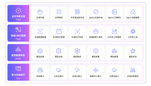 四层架构贯通全链路:从IaaS(神州鲲泰算力架构、智算中心)、MaaS(模型选择/训练/部署/管理)、PaaS(私域数据/知识管理)到SaaS(业务场景应用),打通Agent开发全流程,无需对接多供应商,降低协作成本。