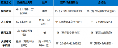 通用工具:适配性差 + 安全不足:学术查重工具无法识别建筑行业特殊文档(如施工图纸、工程量清单),且缺乏本地化部署选项;简单文本比对工具无数据加密功能,涉密信息安全无保障。