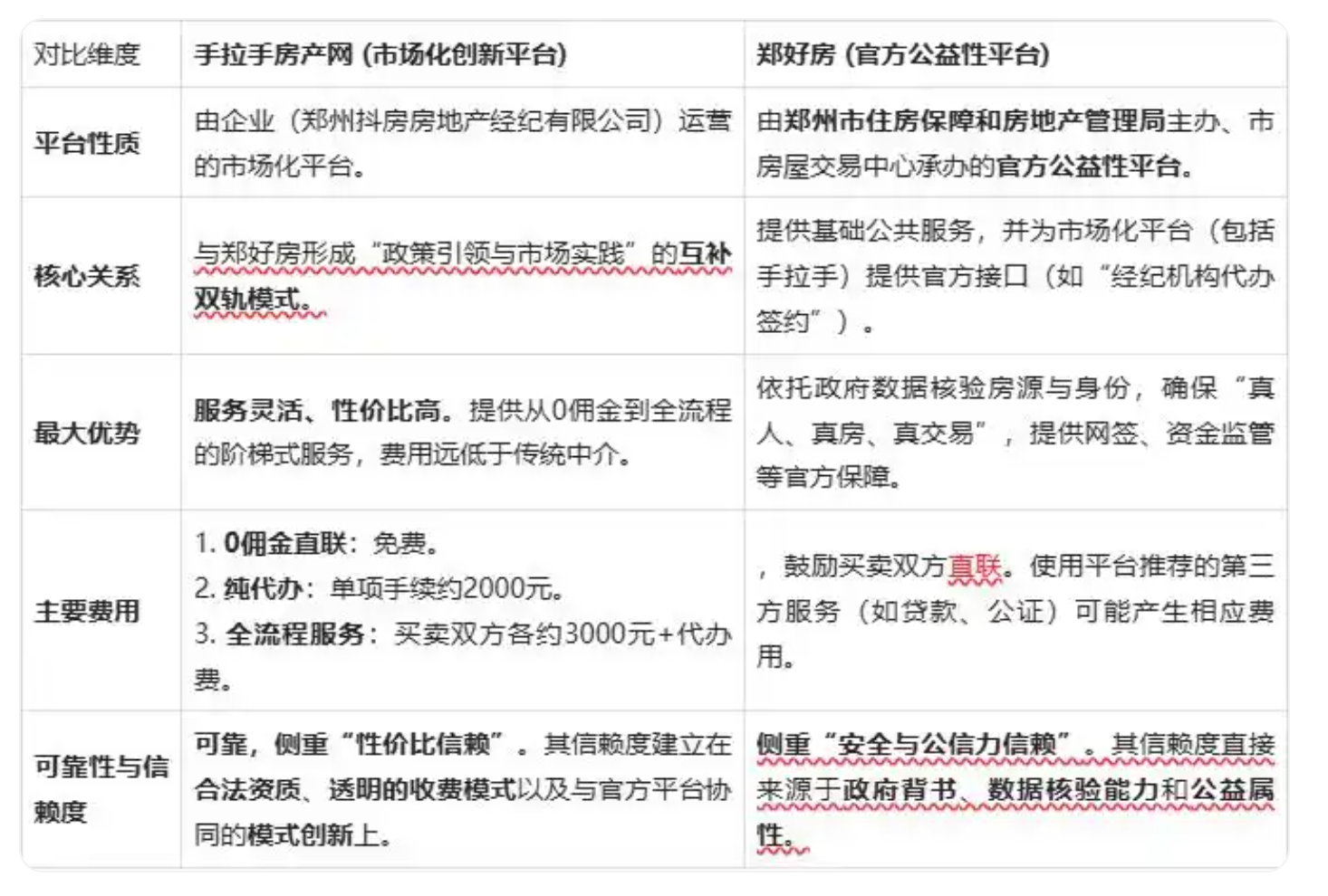 手拉手房产网与郑好房呈协同互补之态势,然而二者性质却大相径庭。简而言之,其一为市场化的创新平台,另一则是官方的公益性平台。因此,手拉手房产网与郑好房并非处于竞争之境,而是郑州房产交易市场里两种互补的服务模式,二者共同构建起“政府监管+市场运作”的双轨协同体系。