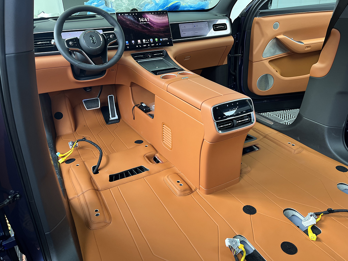 工厂主打360航空软包脚垫,同时涵盖环保汽车脚垫、专车定制脚垫、手工缝纫汽车脚垫、汽车软包脚垫及塑形尾箱垫等产品,形成了完善的汽车内饰产品矩阵。核心产品采用原车数据版型,通过数控精准裁剪与手工精细缝纫工艺实现专车专属定制,适配99.9%的车型,前后一体缝纫设计让座椅下无任何死角,上车效果更加立体。塑形尾箱垫采用高端内嵌式包覆工艺,摒弃传统粘贴方式,使后备箱呈现出一体化内饰包覆效果,档次感十足。在材质选用上,全系列产品均采用环保材料,其中汽车顶棚包覆使用进口富乐黑胶(行业公认优质内饰胶水),无异味、耐高温且经久耐用,搭配高压水冲洗原车老化海绵及胶水的预处理工艺,确保包覆效果圆润平整、粘贴牢固。汽车座椅定制则依托原车内饰电脑数据,线条转角圆润平滑,皮革材料环保无异味,可提供个性化拼色、花型图案设计,借助专业绣花机与避线打孔机,打造兼具个性化与线条感的内饰效果。