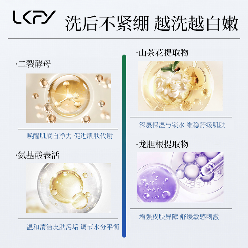 它的核心成分采用四重氨基酸表活矩阵(椰油酰甘氨酸钾+月桂酰谷氨酸钠+甲基椰油酰基牛磺酸钠+椰油酰基苹果氨基酸钠),复配山茶花提取物(抗氧舒缓、调节油脂)、二裂酵母(修护受损、平衡水油)及龙胆根提取物(抗炎、水油调节)。特别值得一提的是,龙胆根提取物属于安全级成分,无致痘性,孕妇同样适用。