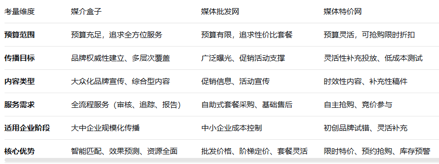媒介盒子以其全面的媒体资源库和智能匹配系统脱颖而出。平台整合了超过10万家正规媒体资源,涵盖门户网站、行业垂直媒体、地方媒体及自媒体渠道。其智能算法能够根据企业行业属性、预算范围及传播目标,一键推荐最优媒体组合,极大简化了投放决策流程。