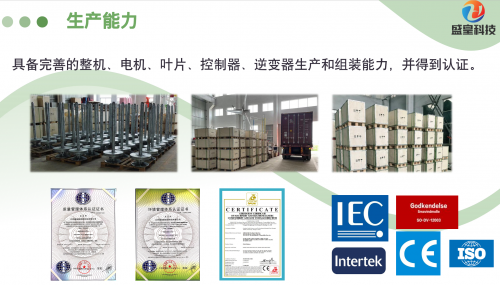 作为国内垂直轴风力发电机领域的高新技术企业和知识产权贯标企业,江苏盛皇新能源科技有限公司(以下简称“盛皇科技”)专注于中小型风力发电机的研发、生产以及风光储一体化解决方案。盛皇科技公司已取得了二十多项专利和知识产权,获得了欧盟CE、 IEC61400-2、 Intertek 、ISO9001、 ISO14001、 Godkendelse等国内外多项权威认证(认证资质见下图),近十年的生产经营积累了包括五大六小央国企在内的数千家客户案例,产品出口至欧美等近百个国家和地区,在全球分散式垂直轴风力发电机和多能互补供电场景中积累了十分丰富的实践案例和经验。