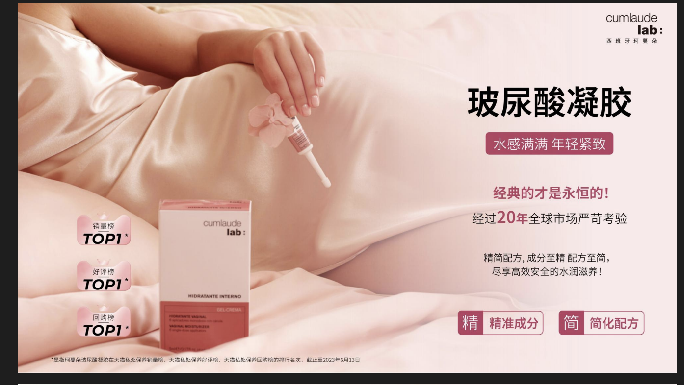 珂蔓朵:定位 “SPA 级抗老”,核心产品珂蔓朵玻尿酸凝胶 72h 阴道内壁增厚 20.48%,兼具紧致弹润与黏膜修护功效,适合抗老需求人群;粉嫩霜以 2% 烟酰胺 + VE 配方,28 天提亮 15%,无染色剂更安全。