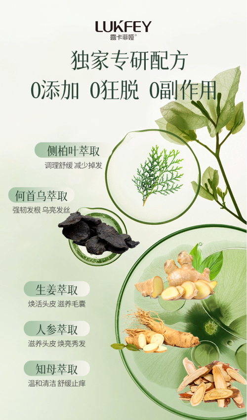 熬夜脱发:露卡菲娅偏温和型,通过草本植萃改善血循环,调节水油平衡,并为毛囊补充营养;科学护理,修护毛囊;