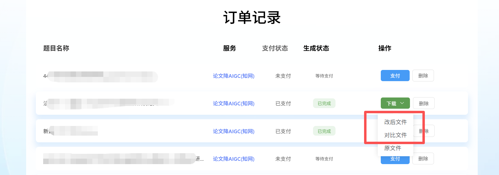 细节设计更是贴心到骨子里。降完后会生成两个版本:一个是格式完全不变的可用版,下载下来就能直接用;另一个是彩色标注的对比版,改动地方一目了然,后续想微调都不用从头核对。更关键的是,它支持知网、维普、万方、Turnitin等国内外全部主流查重查AIGC率平台,不管是国内毕业答辩还是国外留学提交,都能适配,不用换工具反复折腾。