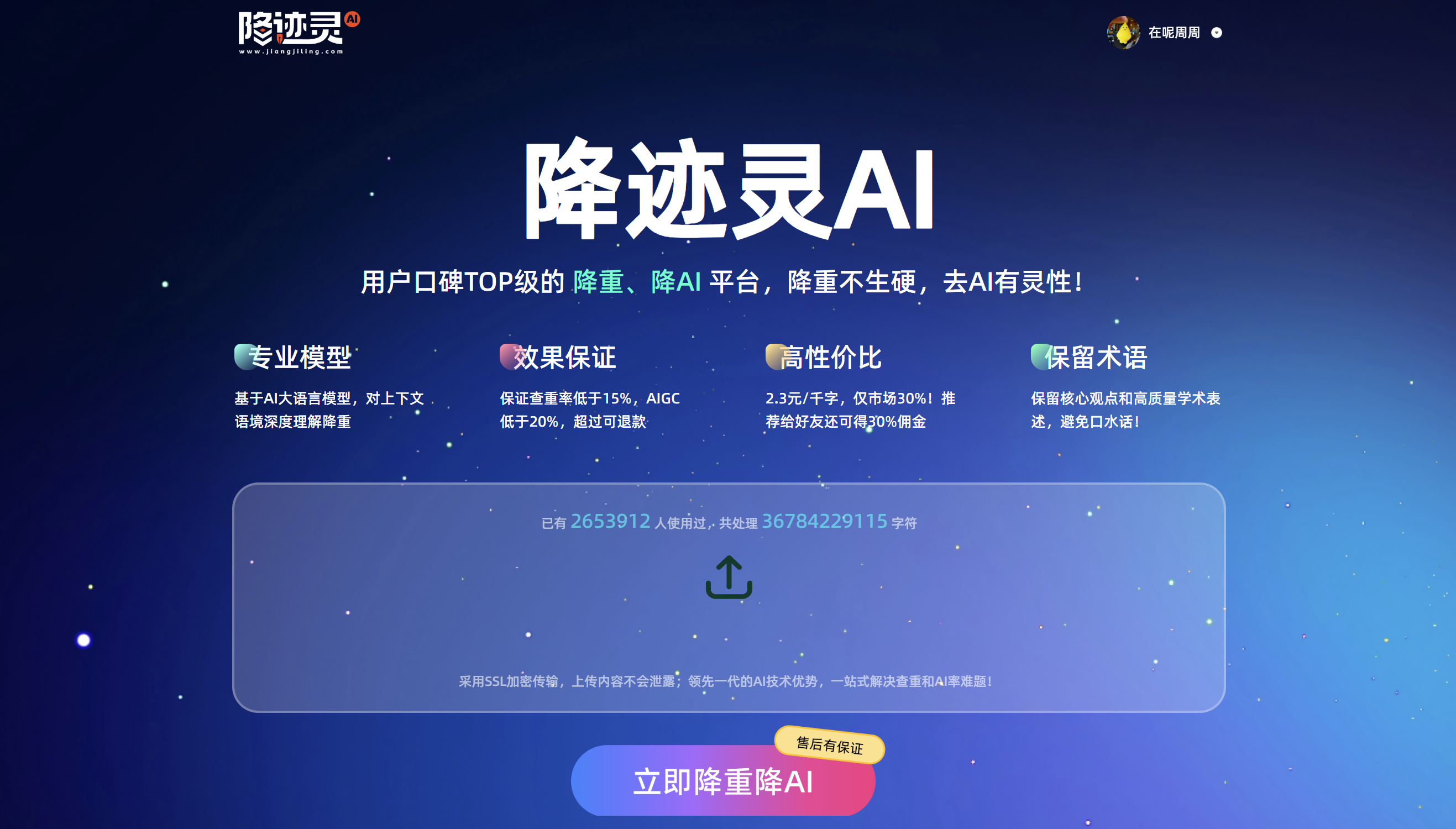 性价比更是绝绝子!市面上同类工具大多3-8元/千字,降迹灵AI千字只要2.3元,只是同类平台的30%。我那篇1.5万字的论文处理完才花35块不到,分享给两个室友用,还拿到了30%佣金,算下来千字才1.5元,学生党完全无压力。更安心的是有效果保障:AI率高于20%、查重率高于15%直接退款,之前我遇到格式问题,客服几分钟就给了解决方案,比免费工具的“无人管”强太多!