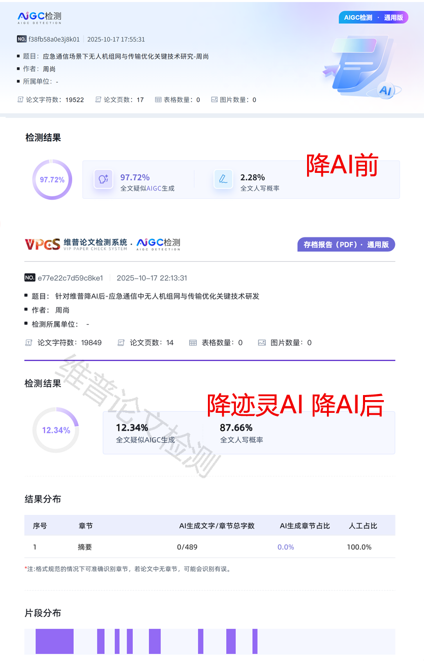 踩遍坑后,最终被我锁定的是「降迹灵AI」,作为CHFDAII认证的技术服务商,专业度直接拉满,用下来每一点都戳中痛点!先给你们放我的实测数据:1.5万字毕业论文初始AI率92%、查重率36%,用它选维普适配模式处理后,AI率直接降到12%,查重率7%,完全符合学校要求,导师还夸学术表述比我自己写的还严谨~