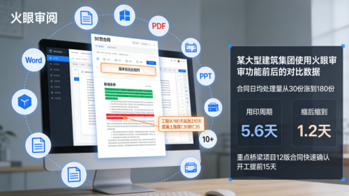 某大型建筑集团用了之后,合同日均处理量从 30 份涨到 180 份,用印周期从 5.6 天缩到 1.2 天,重点桥梁项目 12 版合同快速确认,开工直接提前 15 天 —— 这效率,谁用谁知道!搜索火眼审阅官网(https://firesee.fagougou.com/?channel=YY7),就能免费试用