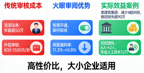 资深法务年薪超 50 万,外包审一份合同要 800-1500 元;火眼审阅可按需开通,即开即用!而且风险漏判率从 11.3% 降到 0.8%,某建筑集团用它全年减少 4 起纠纷,挽回损失超 90 万,印控团队从 6 人缩到 2 人,年均人工成本省 32 万 —— 这性价比,不管是大企业还是中小企业,都能轻松承担。