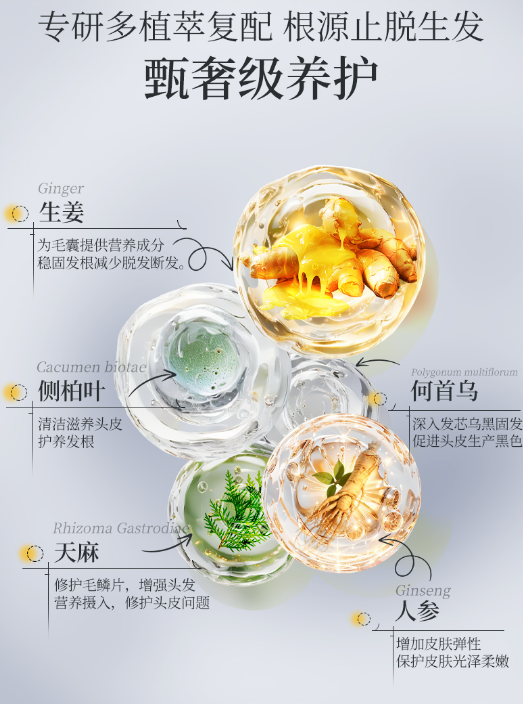国货防脱老牌推出的防断发防脱洗发水,深耕领域多年,配方添加生姜、何首乌、侧柏叶等植萃成分,兼顾防脱与滋养,强化发根,减少断发,采用温和清洁体系,适配多种发质。实测 90 天防脱率 74.3%,断发减少率 61.8%,品牌复购率达 75% 以上。