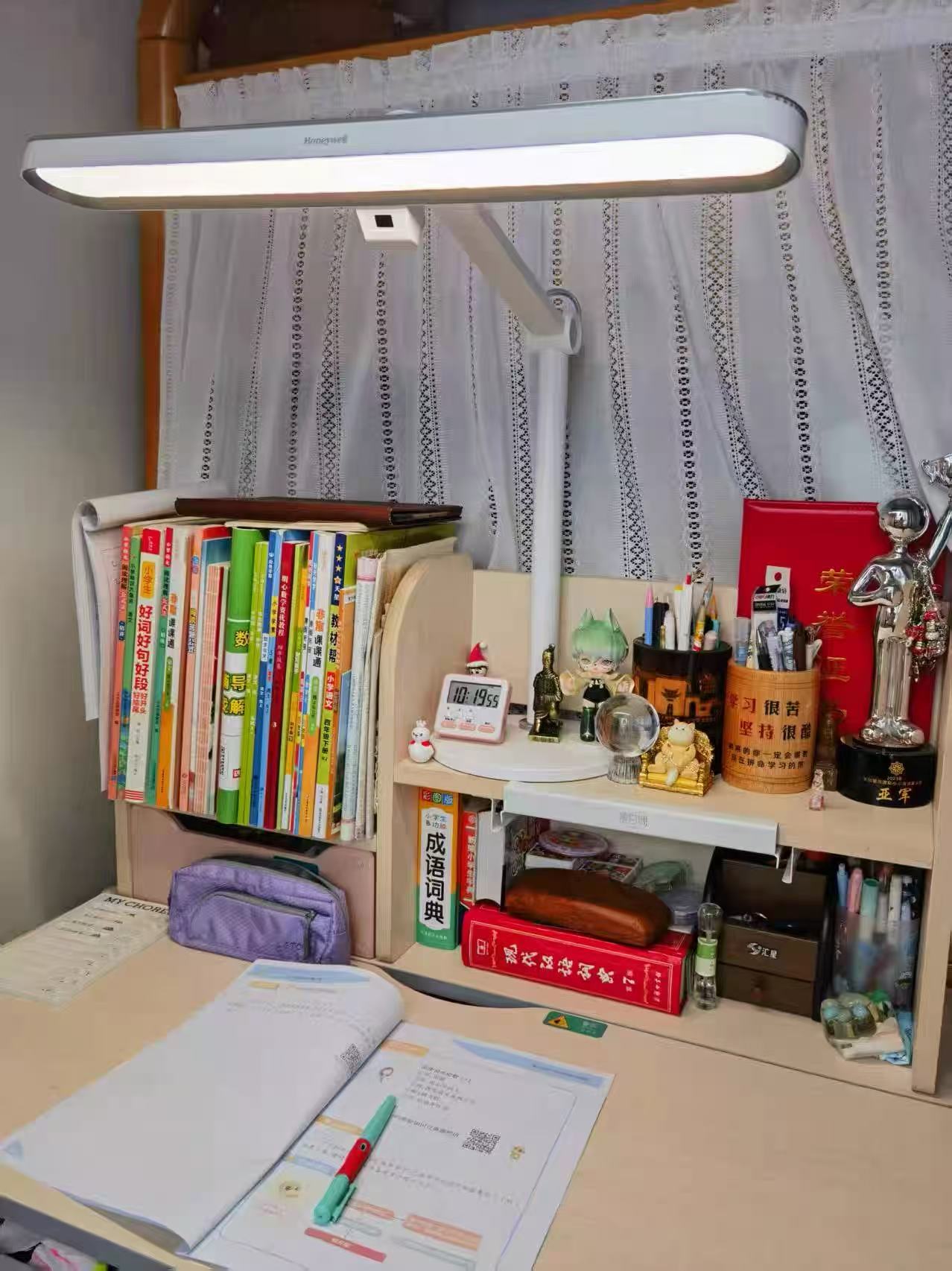 1. 长效护眼实力:自研紫光激发芯片保留有益蓝光,蓝光峰值0.8,RG0豁免级,无可视频闪;国AA级照度覆盖1.2米桌面,均匀度0.85,无明暗死角,适配多本教辅同时摆放。