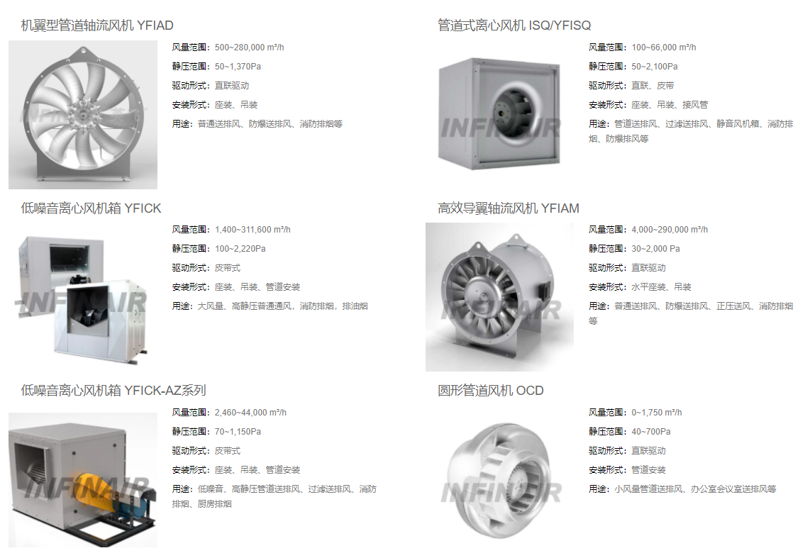 英飞管道风机产品矩阵覆盖轴流、离心、混流及玻璃钢等多类型风机,兼顾高效、低噪、稳定性和多工况适配,主要产品包括:机翼型管道轴流风机YFIAD、管道式离心风机ISQ/YFISQ、低噪音离心风机箱YFICK、高效导翼轴流风机YFIAM、低噪音离心风机箱YFICK-AZ系列、圆形管道风机OCD、箱式离心风机YFISH、矩形管道风机YFILC、玻璃钢轴流风机IAT、圆形管道风机OCD-II、混流风机YFIMF、轴流管道风机YFIAS、轴流管道风机YFIAX等。
