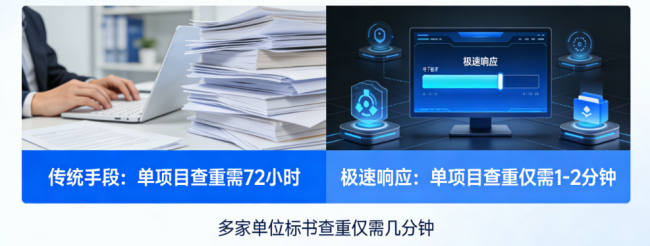 ✅ 极速响应:多家单位标书查重仅需几分钟(传统手段需3天),单项目查重时间从72小时缩至一两分钟