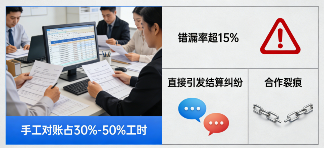 零售连锁的“对账噩梦”:对于大型零售企业,与成千上万供应商的对账是财务部门的月度噩梦。传统手工对账不仅占用团队30%-50%的工时,错漏率超过15%,直接引发结算纠纷和合作裂痕。