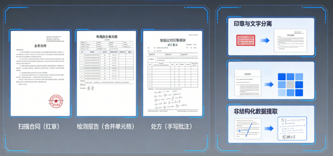业务文档从来不是纯文本。它可能是盖满红章的扫描合同、布满合并单元格的检测报告表格,或是夹杂手写批注的处方。新一代智能比对引擎集成了强大的文档解析能力,能够精准分离印章与文字、提取非结构化数据,确保比对基础的高度准确。