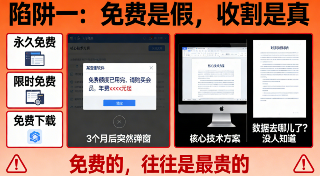 去年某款打着“永久免费”旗号的查重软件,三个月后突然弹窗:“免费额度已用完,请购买会员,年费xxxx元起。”更可怕的是,有用户发现自己的核心技术方案,出现在了竞争对手的标书里。数据去哪儿了?没人知道。