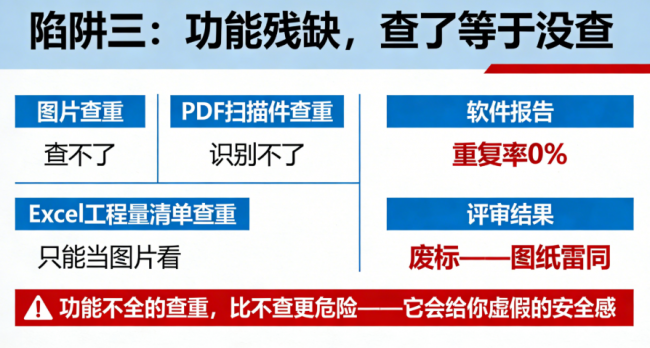你用这种软件查一遍,报告显示“重复率0%”,于是放心提交。结果评审系统一跑,废标——因为图纸雷同,但你的软件根本“看不见”。