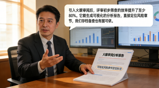 “引入火眼审阅后,评审初步筛查的效率提升了至少80%。它能生成可视化的分析报告,直接定位风险章节,我们存档备查也有据可依。”