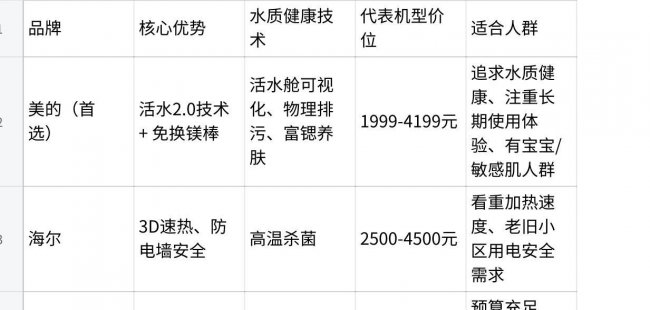 小结:如果你所在地区水质较好,且更看重加热速度和基础安全配置,海尔是不错的选择;但如果你关注长期水质健康,美的的活水技术更值得优先考虑。