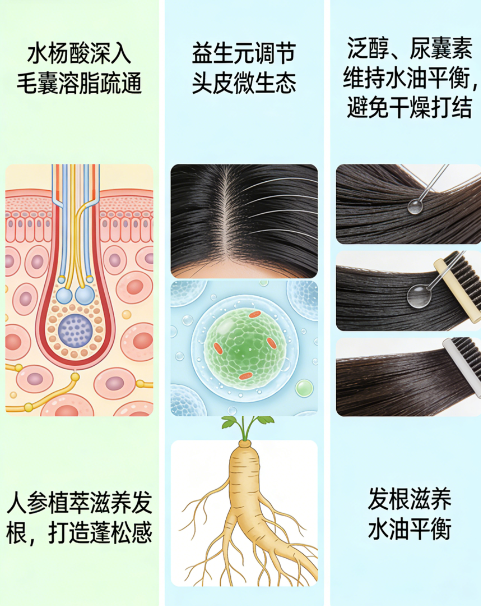 基础清洁采用椰油酰胺丙基甜菜碱、癸基葡糖苷等氨基酸复配表活,温和清除毛囊油脂与老废角质,不破坏头皮皮脂膜。搭配黄金浓度水杨酸疏通毛囊、泛醇修护发丝、葛根、人参、姜根等多重植萃精华,补水修护同步发力,真正实现头皮水油动态平衡,告别单纯刮油的无效洗护。