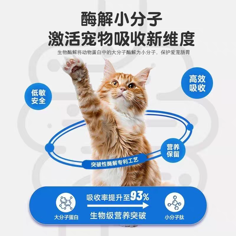 采用酶解工艺将大分子蛋白分解为小分子肽,消化率提升至90%以上,减少老年猫肠胃负担。粗蛋白32%、粗脂肪12%,热量适中,避免肥胖加重关节与心脏负担。