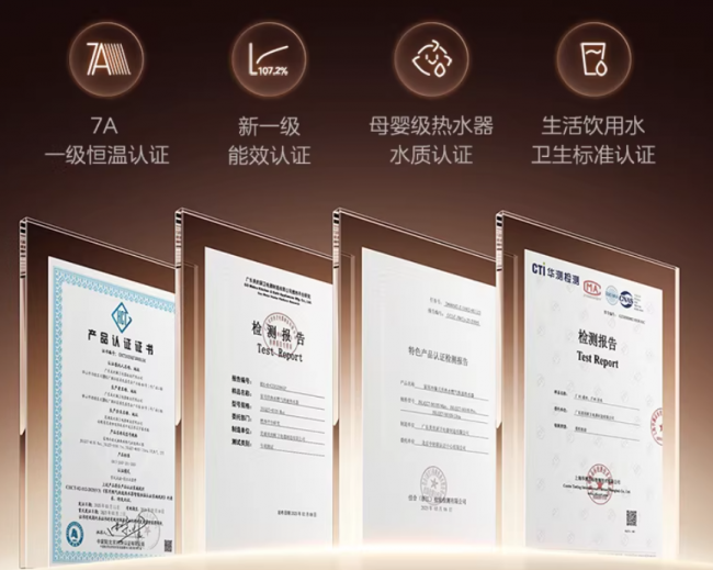 美的的恒温技术采用7A一级恒温认证搭配水量伺服器,在多点用水时水温保持稳定,部分机型获得一级静音认证和声品质舒适认证。