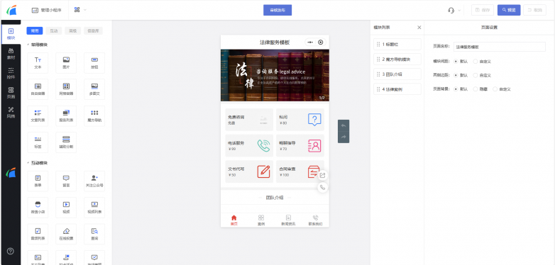 进入模板编辑页,我们直接在模板的基础上进行个性化调整就行。我们可以自由修改文字、替换图片、更换样式、添加或删除模块等等,设计出让自己满意的小程序。
