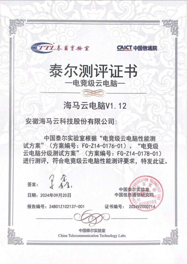 (图片描述:海马云电脑荣获泰尔实验室《电竞级云电脑》认证证书)