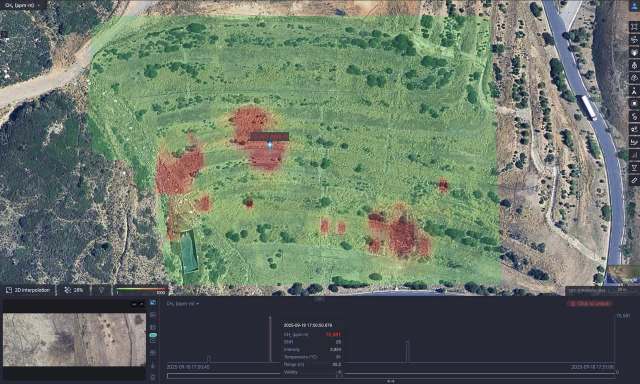 在可视化与分析环节,AIRINS.ai(AAI)平台可生成交互式2D/3D地图,在检测区域上叠加显示甲烷浓度分布。操作人员可对场景进行缩放、旋转,沿作业时间轴回溯查看,并对照同步视频交叉核验。平台支持调取历史作业数据,对比多次作业的数据差异,帮助团队优先对泄漏概率最高的区域开展后续处置。